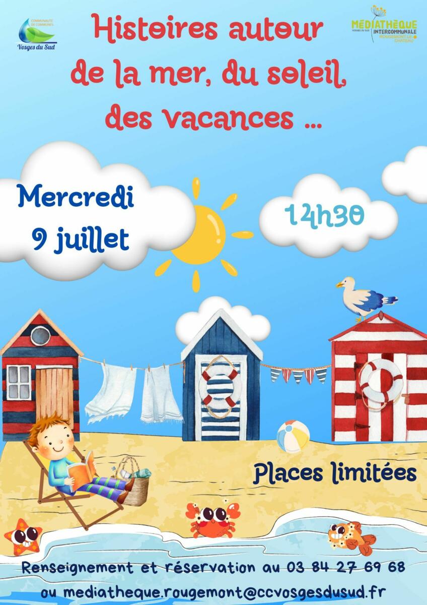 Petits et grands peuvent venir écouter des histoires autour de la mer, du soleil et des vacances justement...le mercredi 9 Juillet à 14 h 30 à la médiathèque de Rougemont-le-Château, en compagnie de Christine, bénévole et de Karine. Cette animation gratuite se tiendra dans la grande salle du foyer rural.