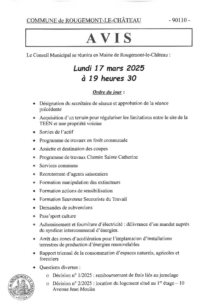 Le Conseil Municipal se réunira lundi 17 mars 2025 à 19 heures 30 en salle d'Honneur de la Mairie.