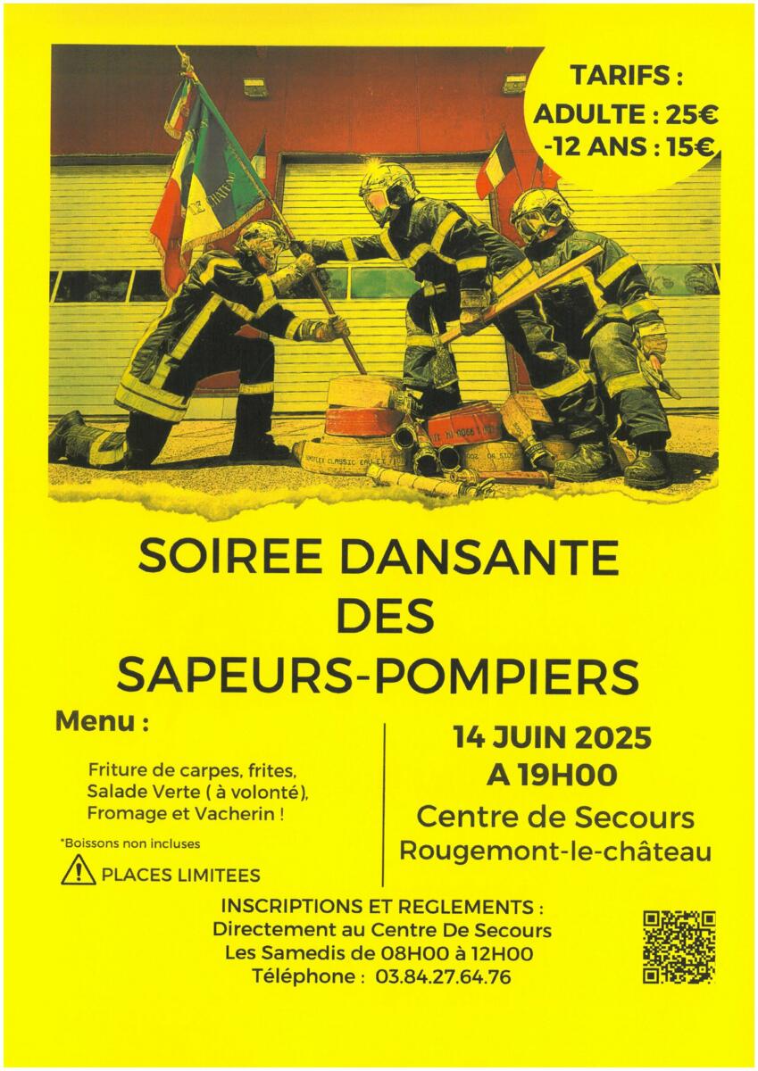 Soirée dansante des Sapeurs-Pompiers 12/05/2025 📅 Samedi 14 juin 2025 à 19h 🚒 Centre de Secours de Rougemont-le-Château