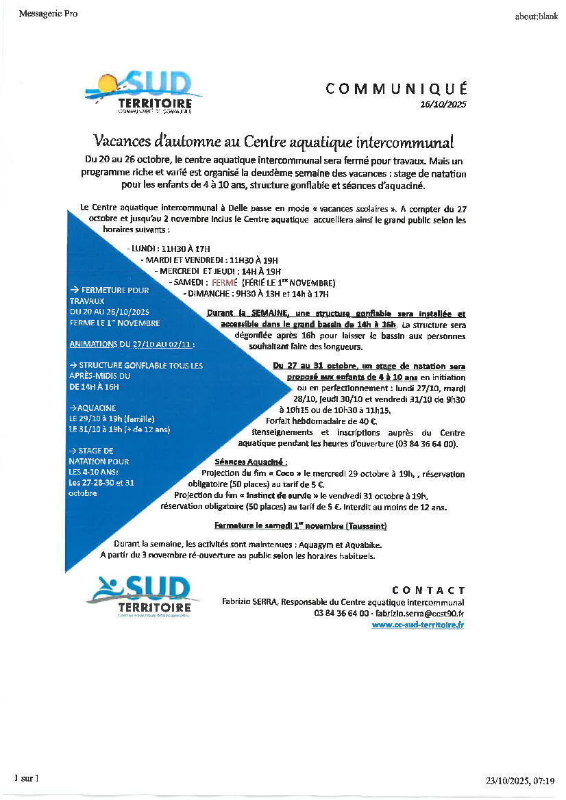 HORAIRES MODIFIES CENTRE AQUATIQUE DE DELLE
