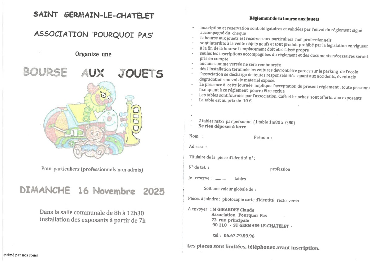 L'association "Pourquoi Pas" organise une bourse aux jouets le dimanche 16 novembre 2025 de 8h à 12h30 à la salle communale.