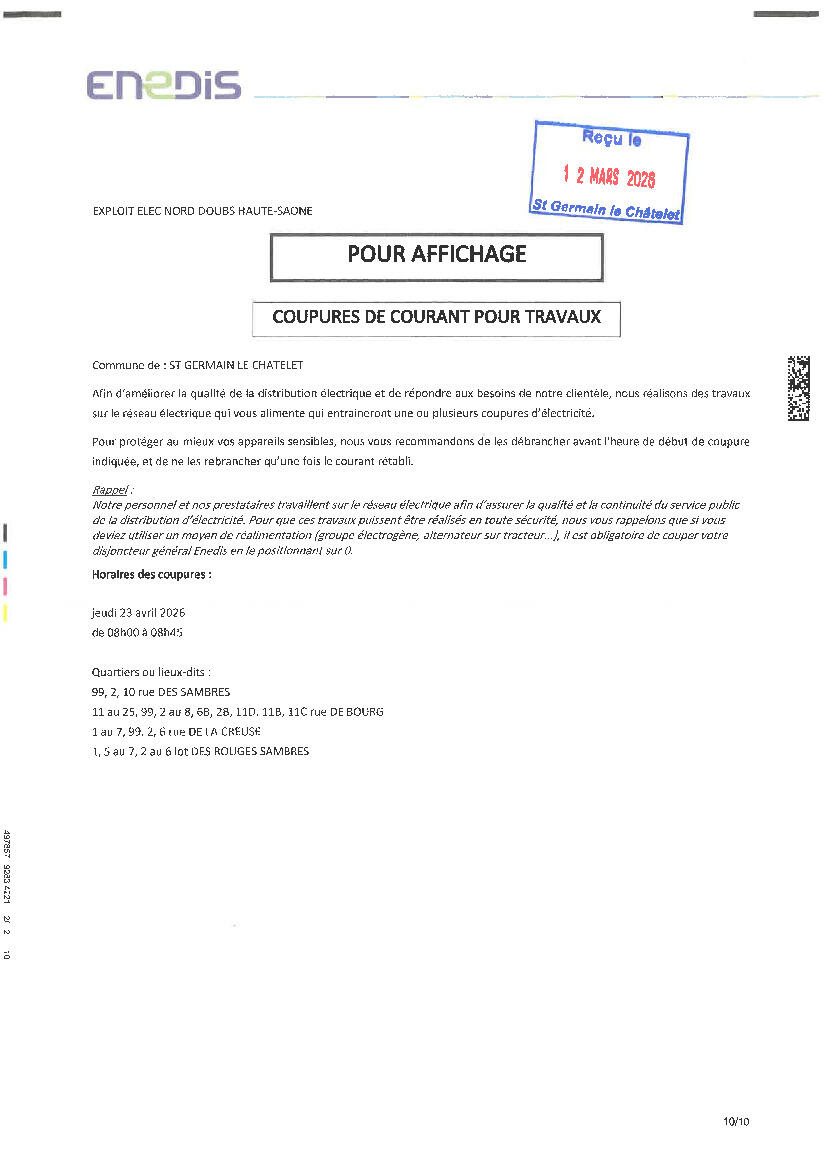 En raison de travaux sur le réseau électrique, ENEDIS a programmé des coupures d'électricité le jeudi 23 avril de 8h à 8h45 et de 14h45 à 15h30.