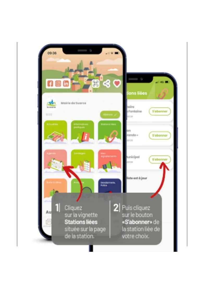 Rendez-vous sur la page d'accueil de la mairie de Suarce puis cliquez sur l'icône stations liées et abonnez-vous à celles de votre choix.