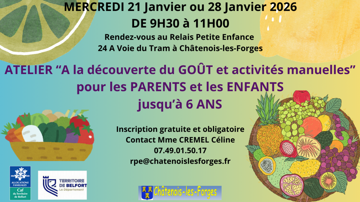 L'équipe Petite Enfance de Châtenois les Forges propose un atelier pour les enfants de 0 à 6 ans et leurs parents sur le thème “A la découverte du GOÛT et activités manuelles”