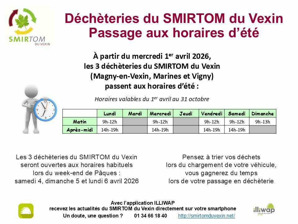 Horaires D'été Déchèteries 26/03/2026 Bonjour, à partir du mercredi 1er avril 2026, les 3 déchèteries du SMIRTOM du Vexin (Magny-en-Vexin, Marines et Vigny) passent aux horaires d’été. Voici les nouveaux horaires valables du 1er avril au 31 octobre :