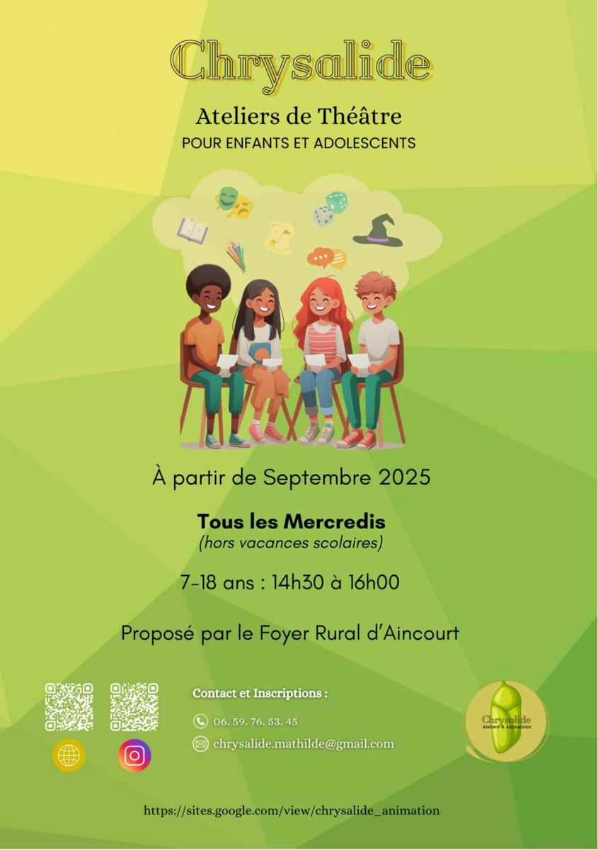 Chrysalide propose un atelier théâtre animé par Mathilde. Elle accompagnera les enfants et adolescents dans une démarche de développement personnel, à travers des activités, des jeux et des propositions toujours plus modernes et originales.