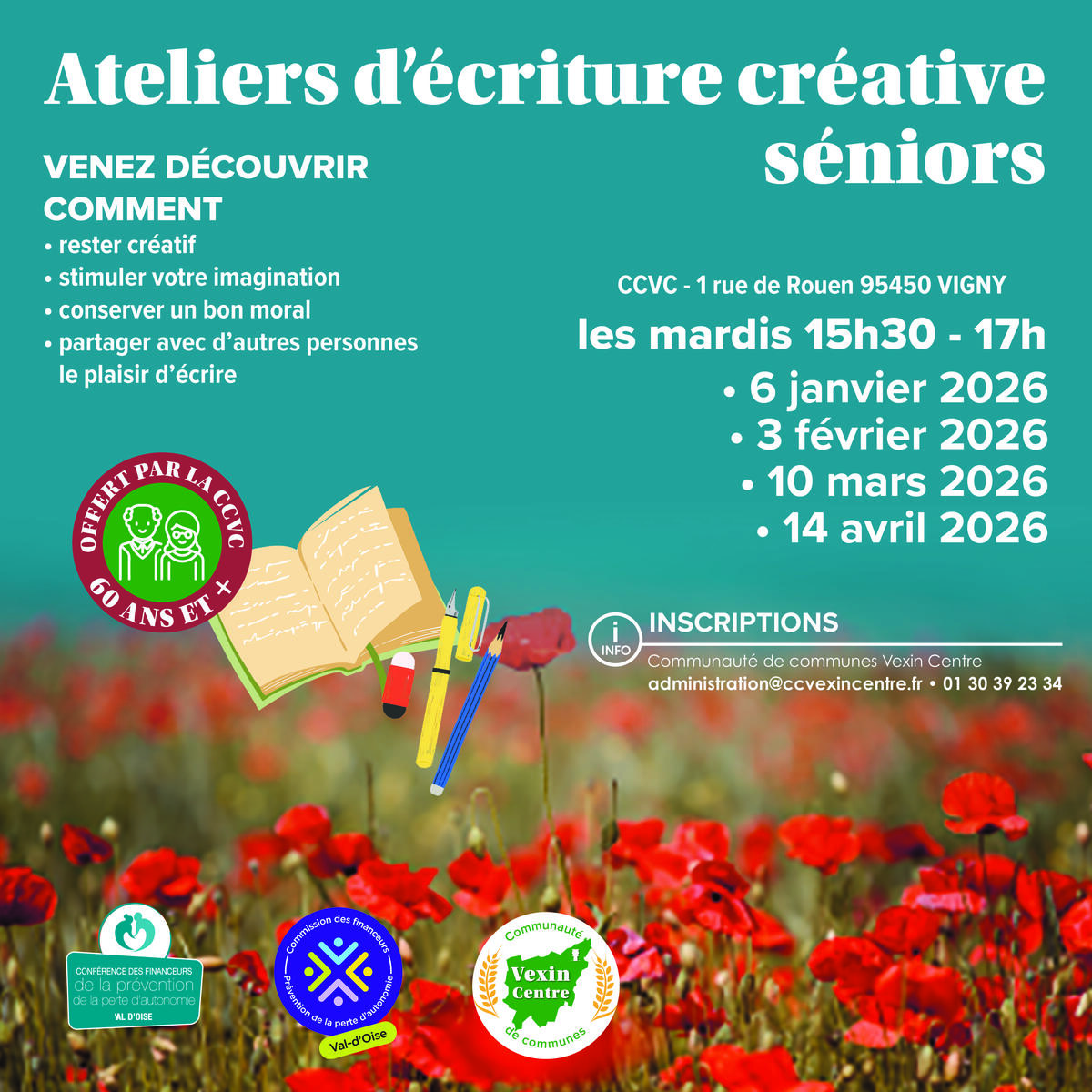 La communauté de communes Vexin Centre organise des sessions d’écriture créative pour les seniors jusqu’au mois d’avril, à raison d’une séance par mois, les mardis à Vigny. Plus d'infos sur le site web de la CCVC.