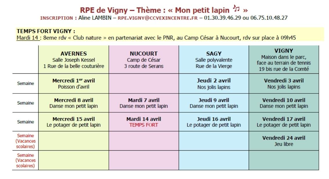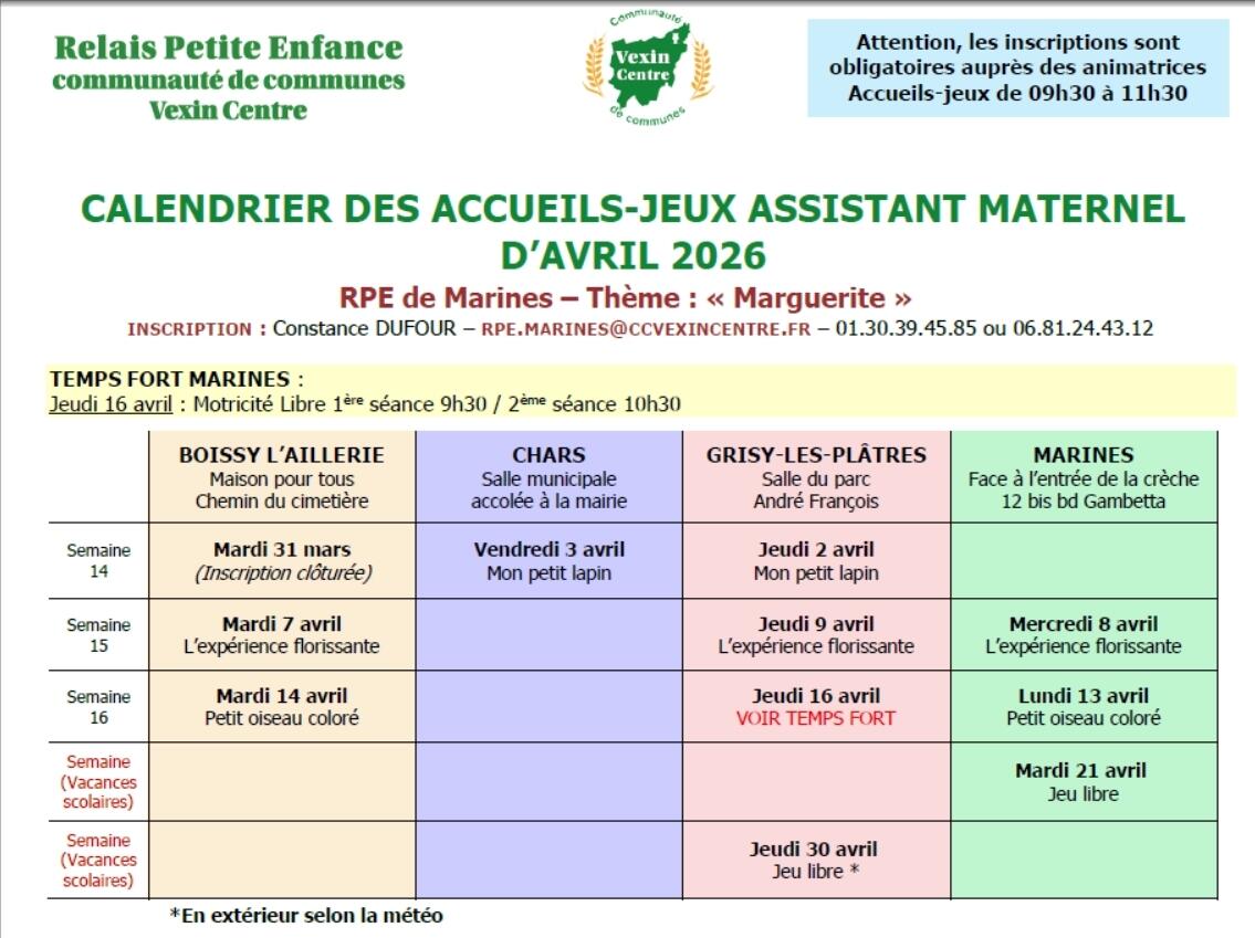 Voici le planning des accueils-jeux du RPE (Relais Petite Enfance) pour avril 2026, de Marines et Vigny.