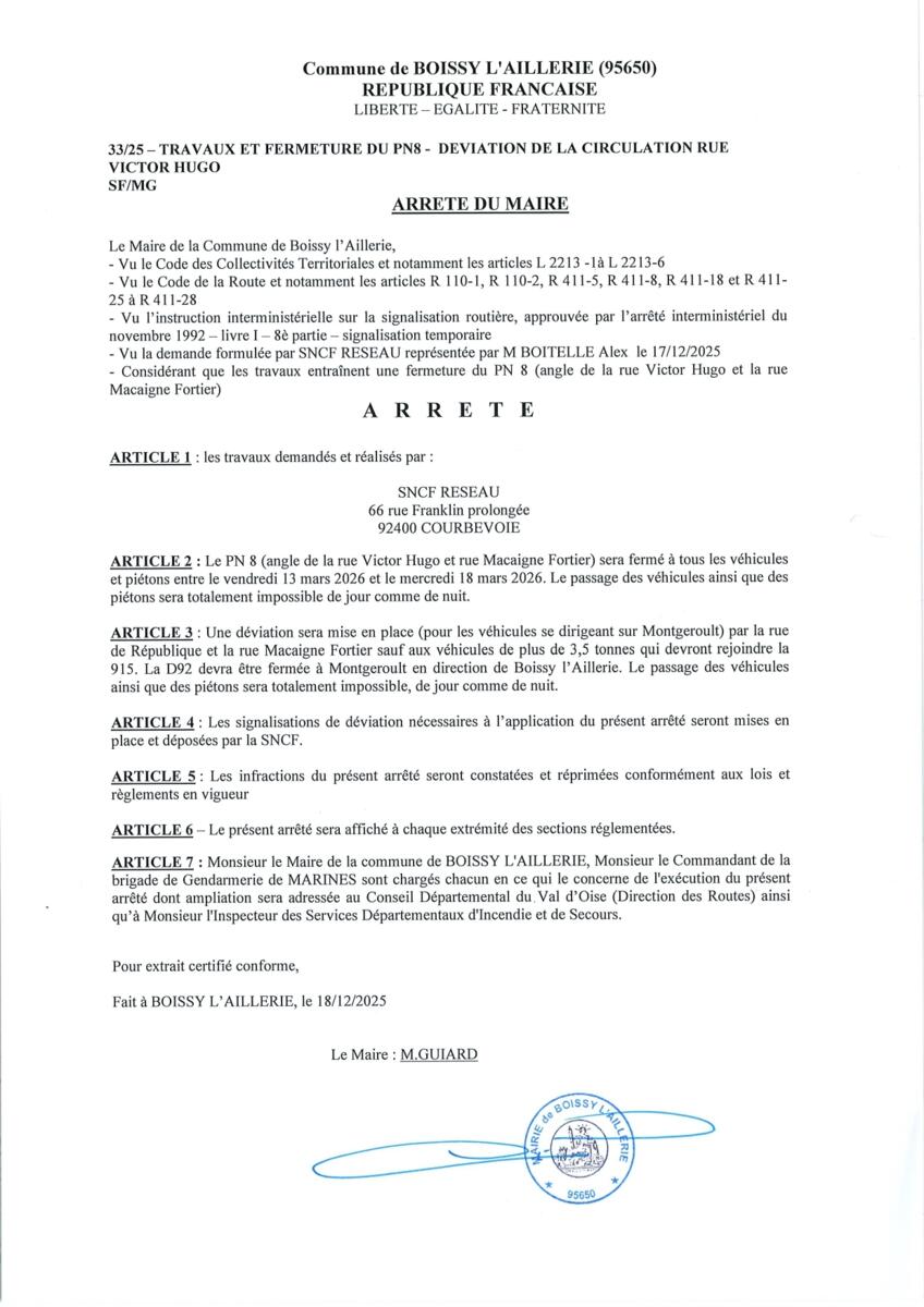 Le passage à niveau PN8 sera fermé du vendredi 13 mars 22h au mercredi 18 mars 6h00, une déviation sera mise en place (voir arrêté du Maire)