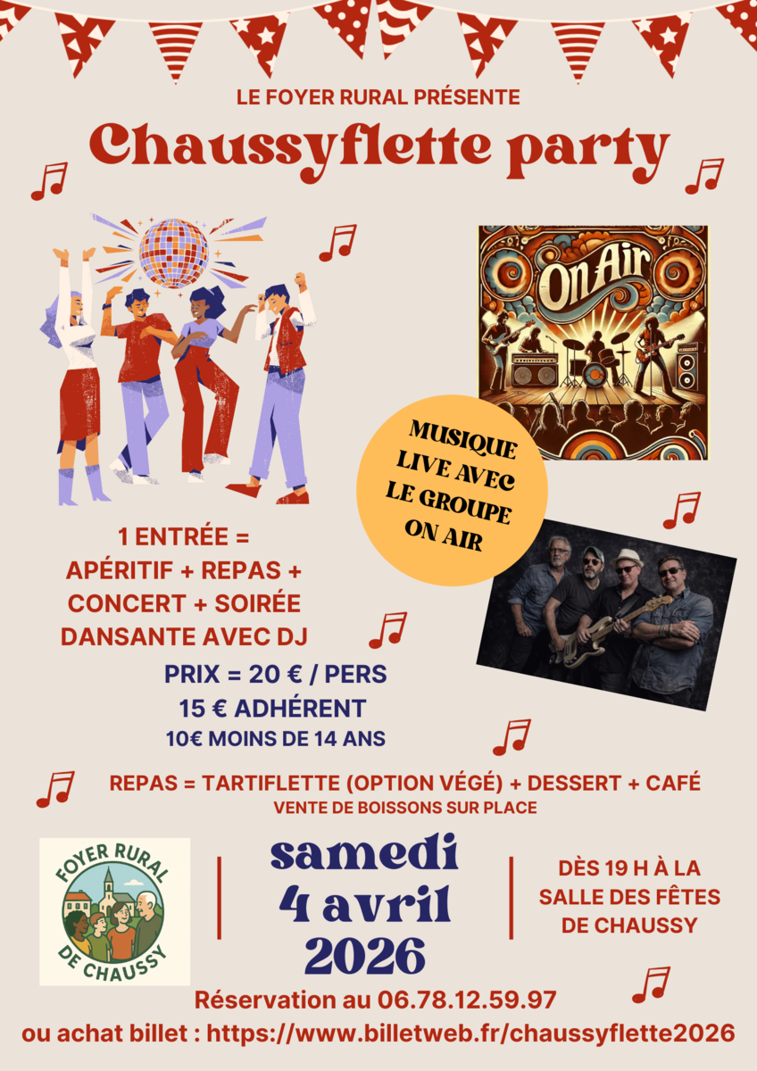 Réservations auprès de Michèle au 06 78 12 59 97 ou sur la billetterie en ligne : :https://www.billetweb.fr/chaussyflette2026