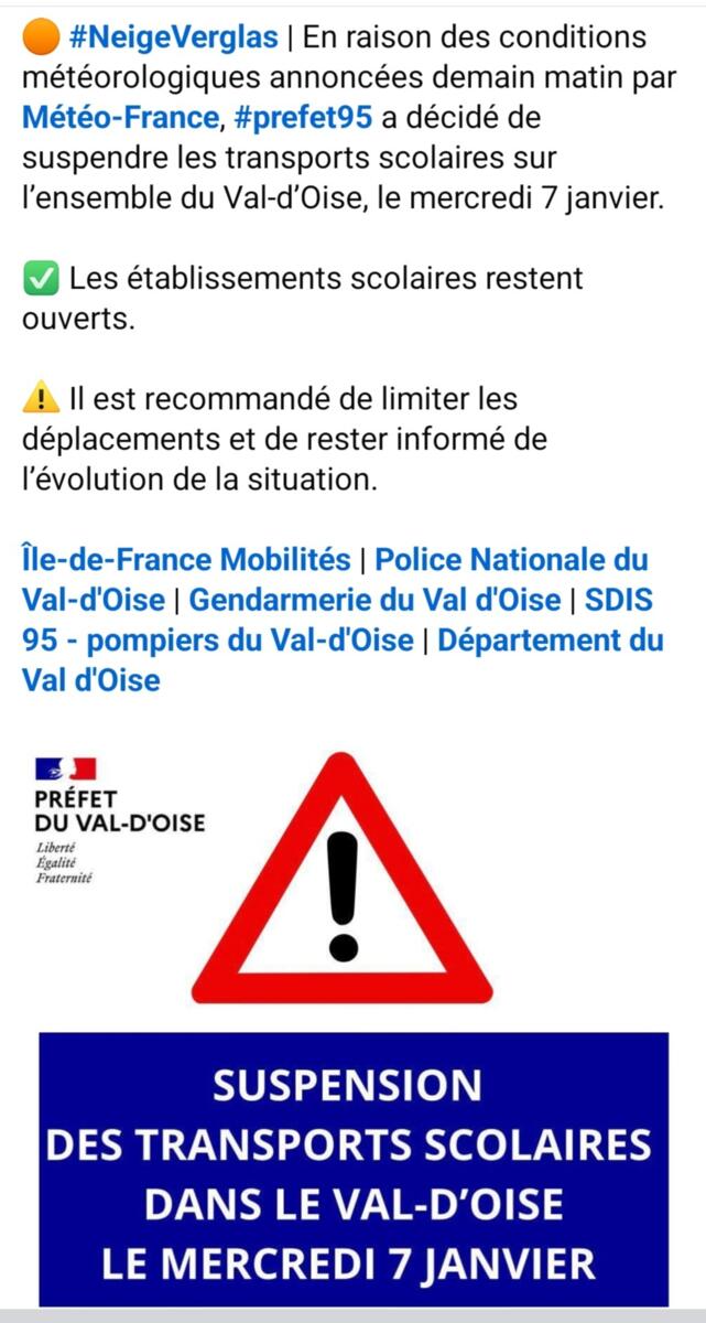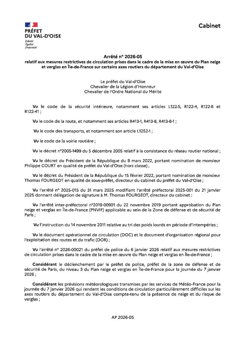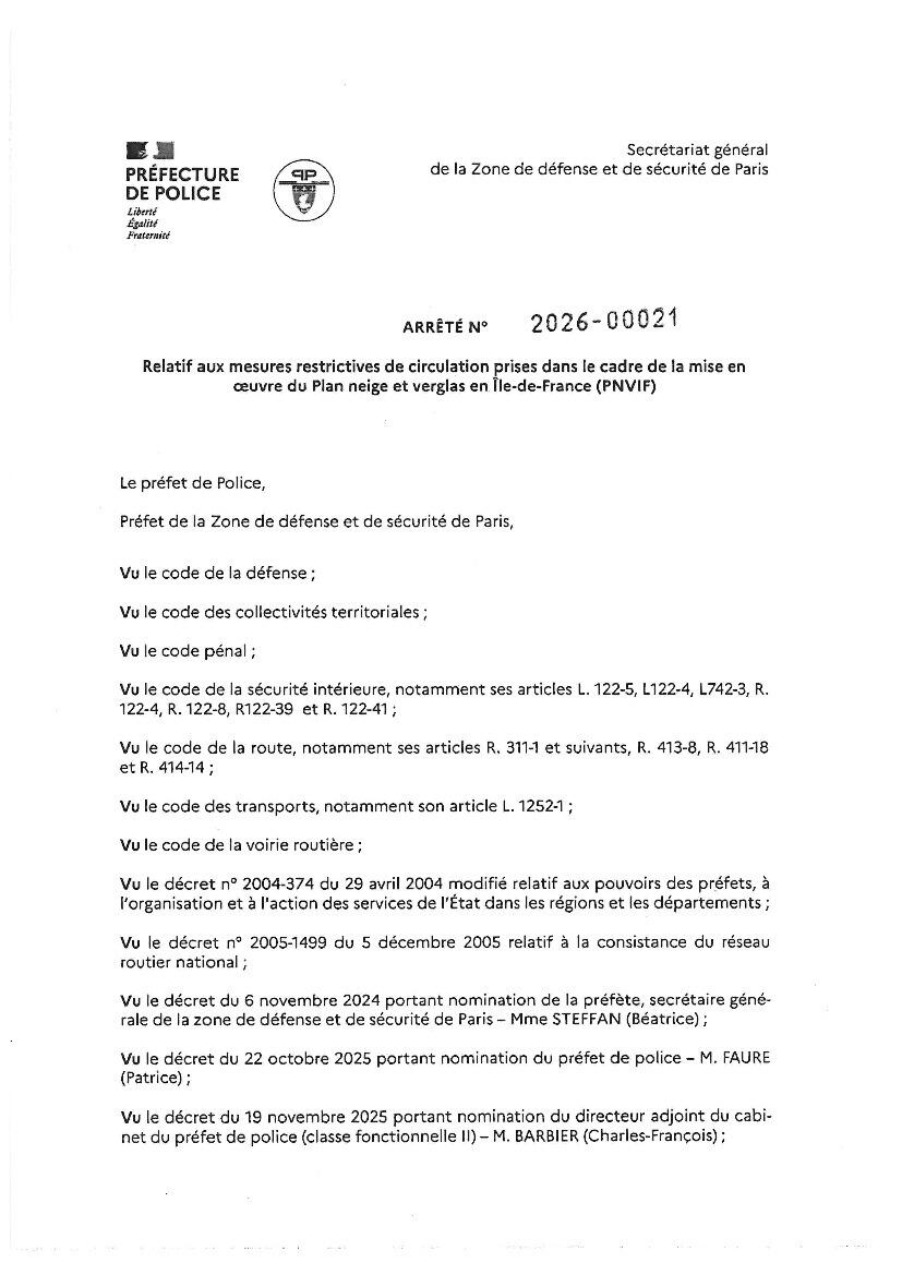 Vous trouverez en pièce jointe l'arrêté n° 2026-00021 relatif aux mesures restrictives de circulation prises dans le cadre de la mise en œuvre du "plan neige et verglas en Île-de-France"ainsi que l'arrêté préfectoral n°2026-05 relatif aux mesures restrictives de circulation prises dans le cadre de la mise en œuvre du Plan neige et verglas en Ile-de-France sur certains axes routiers du département du Val-d’Oise.
