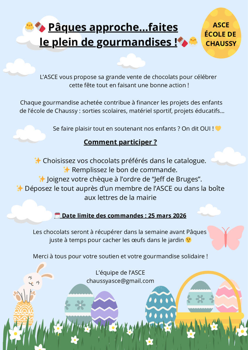 L’ASCE de l’école de Chaussy lance sa grande vente de chocolats pour célébrer cette fête gourmande tout en soutenant nos enfants.