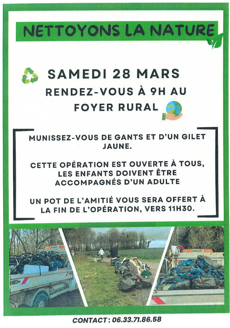 Nettoyons La Nature 18/03/2026 Le club Rando organise : nettoyons la nature Samedi 28 mars RdV au foyer rural à 9h Venir avec gants ménagers et gilet jaune Les enfants doivent être accompagnés d'un adulte Un pot de l'amitié clôturera cette opération vers 11h30