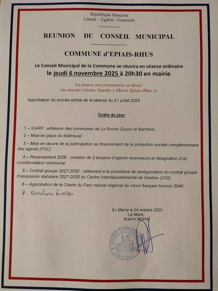 CONSEIL MUNICIPAL DU 6 NOVEMBRE - ORDRE DU JOUR