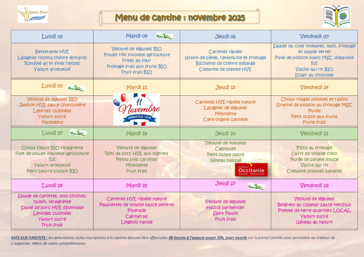 MENU CANTINE MOIS DE NOVEMBRE 2025
