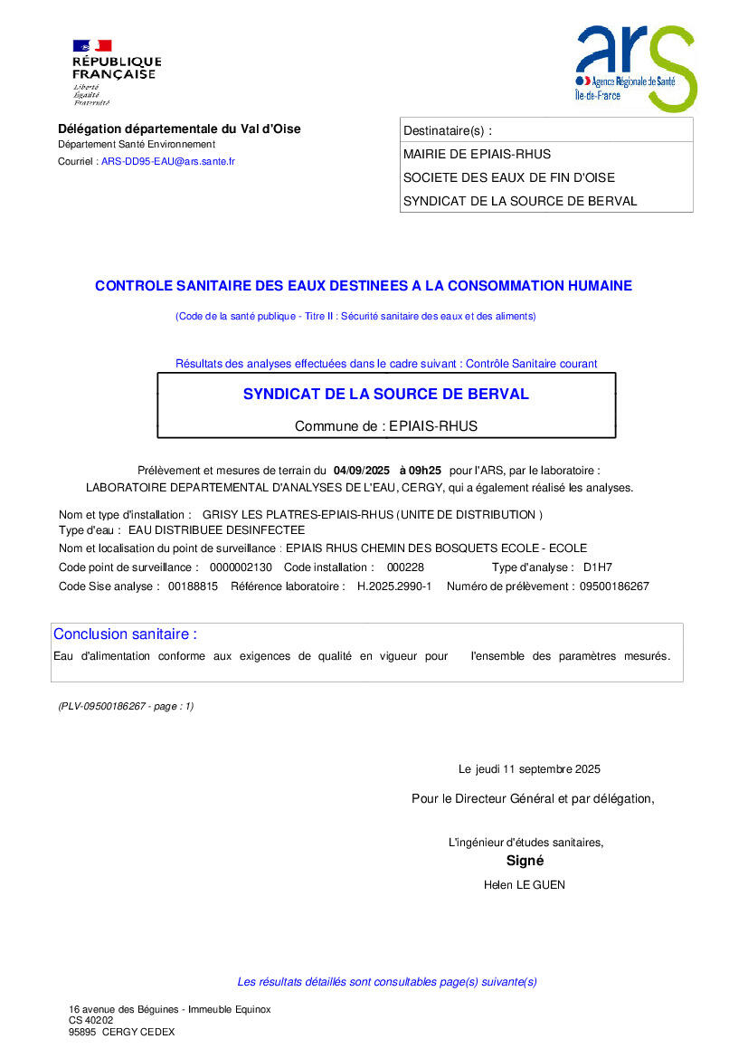 Résultats d'analyses de la qualité de l'eau par l'ARS
