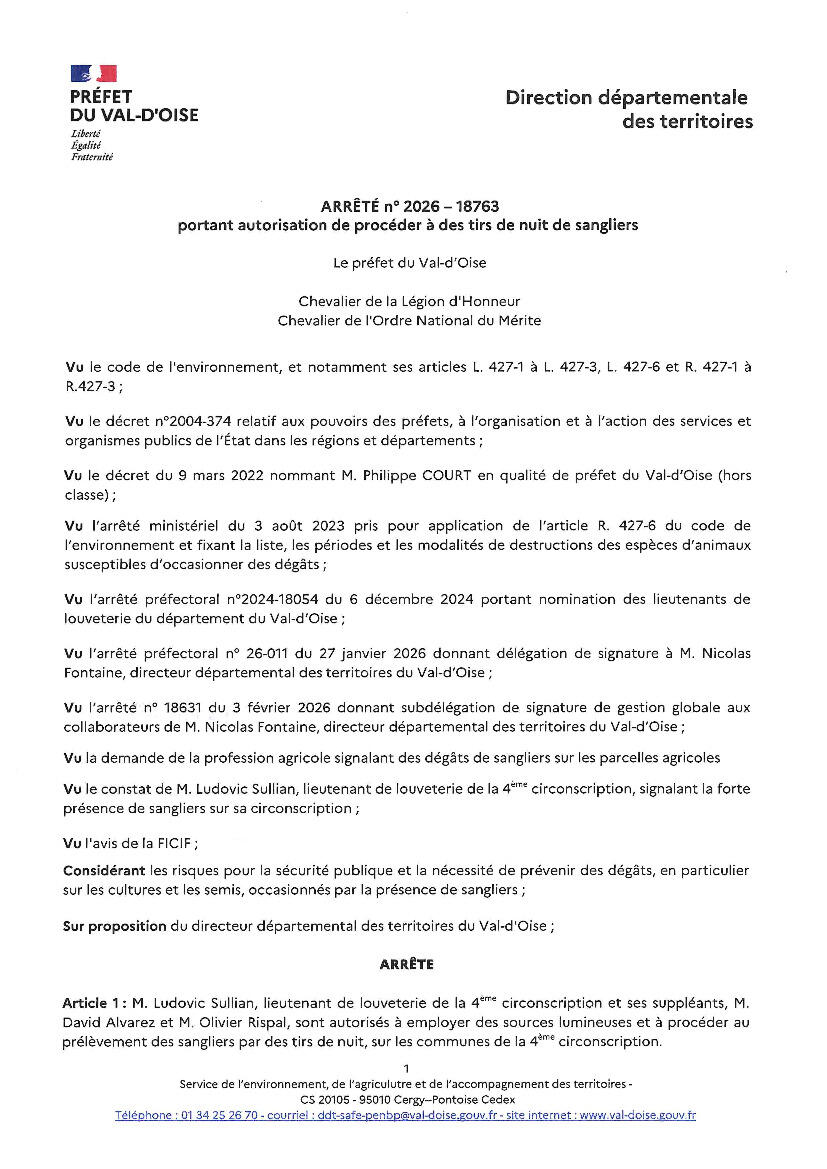 Veuillez trouver ci-joint un arrêté préfectoral portant autorisation de procéder à des tirs de sangliers sur les communes de la 4ème circonscription de louveterie du Val d'Oise.