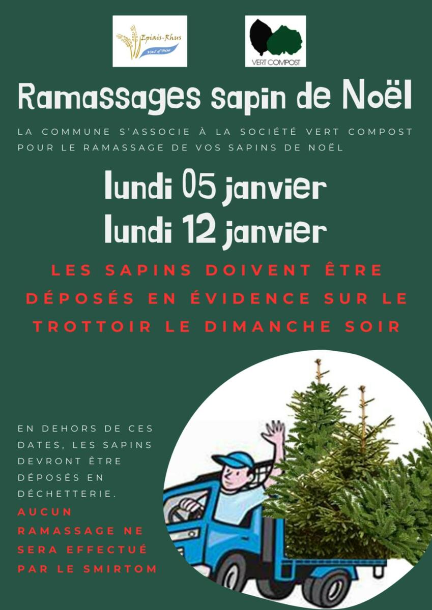 Nous vous informons que le ramassage des sapins de Noël aura lieu lundi 5 janvier 2026 et lundi 12 janvier 2026.  Pour que votre sapin soit récupéré, merci de bien vouloir le déposer sur le trottoir la veille.