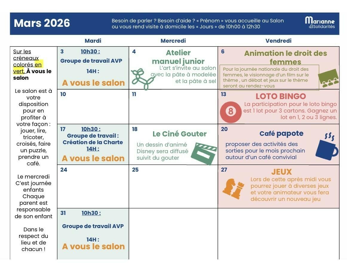 Le Planning Des Activités De La Résidence Pissaro ! 09/03/2026 Voici les différentes activités proposées sur le mois de mars !