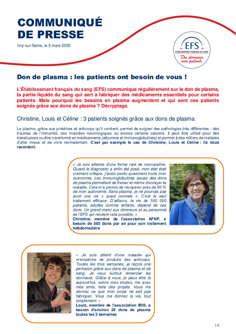 L'établissement Français du sang recrute de nouveaux donneurs de plasma, pour soigner les malades, toujours plus nombreux et éviter de se retrouver face à des pénuries de traitement qu’ont pu connaître certains patients, comme par exemple lors du COVID, où certains malades n’ont pas pu avoir accès toutes les 3 semaines à leurs traitements à base d’immunoglobulines et ont dû patienter au détriment de leur santé…