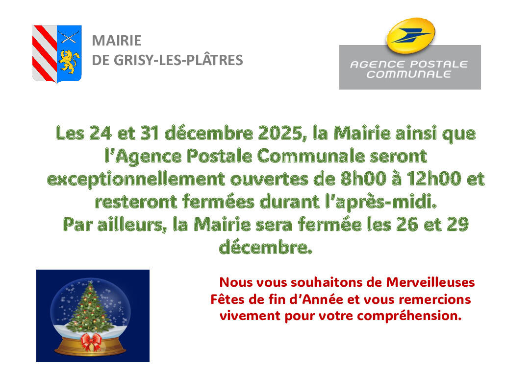 Les 24 et 31 décembre, la mairie et l’agence postale communale seront exceptionnellement ouvertes de 8h à 12h et fermées l’après-midi.