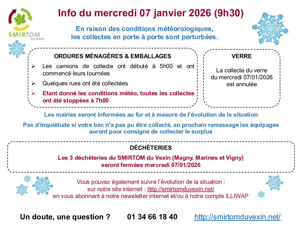 Déchetteries fermées aujourd'hui 07/01/2026 07/01/2026 Les déchetteries de Marines, Magny en Vexin et Vigny sont fermées aujourd'hui.
