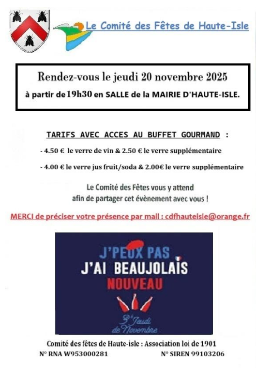 Rendez vous dans la salle de la Mairie de Haute Isle le Jeudi 20 Novembre 2025 à partir de 19 h 30. Nous comptons sur vous 😏