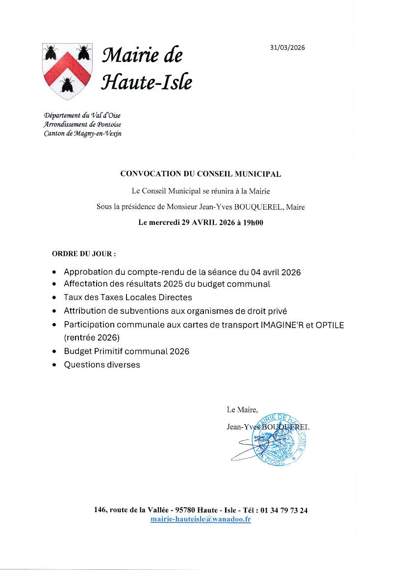 Conseil Municipal Haute Isle Le 29/04/2026 16/04/2026 Bonjour, Le Conseil Municipal de Haute-Isle se réunira le mercredi 29 avril 2026 à 19h00. Veuillez trouver ci dessous l'ordre du jour. La Mairie