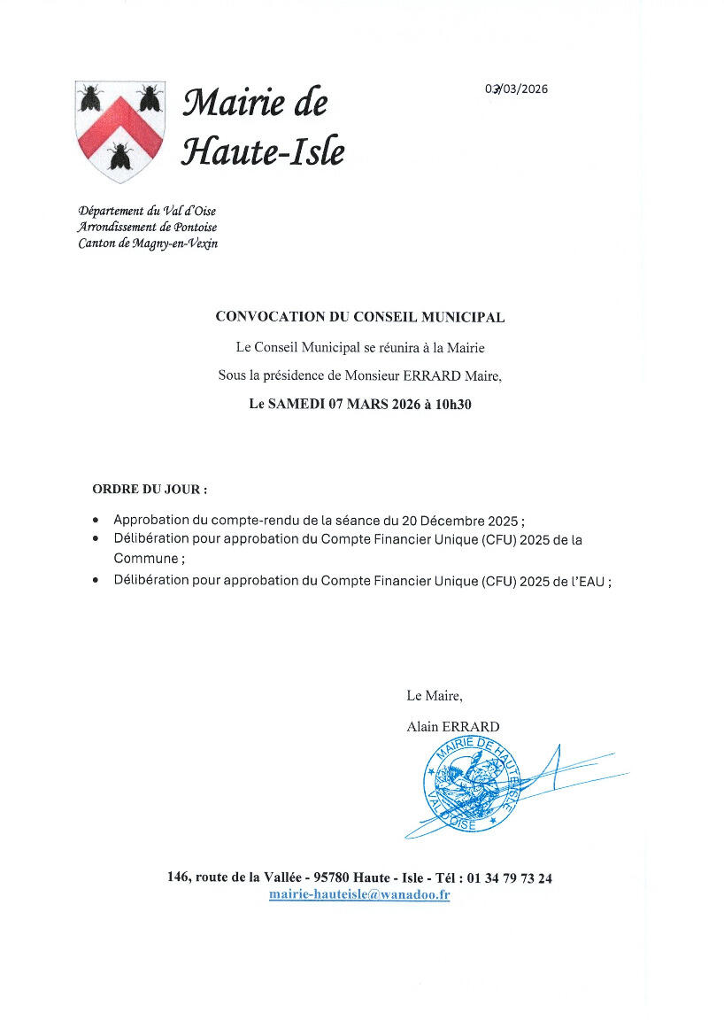 Conseil Municipal Le 07/03/2026 À 10H30 05/03/2026 Bonjour, Le Conseil Municipal de Haute-Isle se réunira le samedi 7 mars 2026 à 10h30. Veuillez trouver ci dessous la convocation avec l'ordre du jour. La Mairie