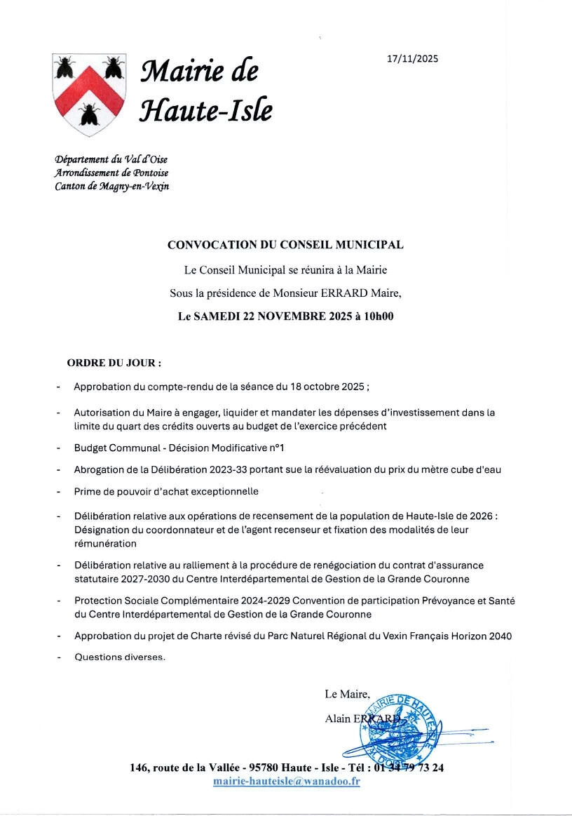 Conseil Municipal Le 22 Novembre 2025 18/11/2025 Bonjour, Le Conseil Municipal de Haute-Isle se réunira le samedi 22 novembre 2025 à 10h en salle communale.