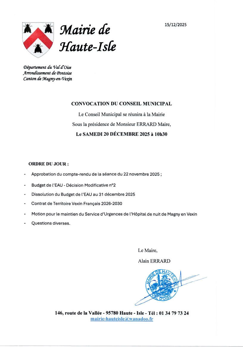 Conseil Municipal Le Samedi 20/12/2025 À 10H30 15/12/2025 Bonjour, Le Conseil Municipal de Haute-Isle se réunira ce samedi 20 décembre 2025 à 10h30.