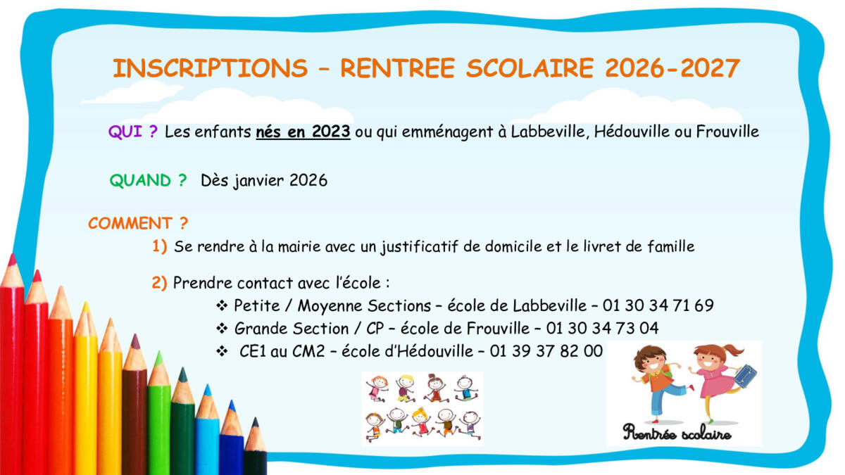 Pour établir nos effectifs, nous avons besoin de savoir au plus tôt si vous scolariserez votre enfant dans notre Regroupement Pédagogique Intercommunal (RPI) Labbeville-Frouville-Hédouville.