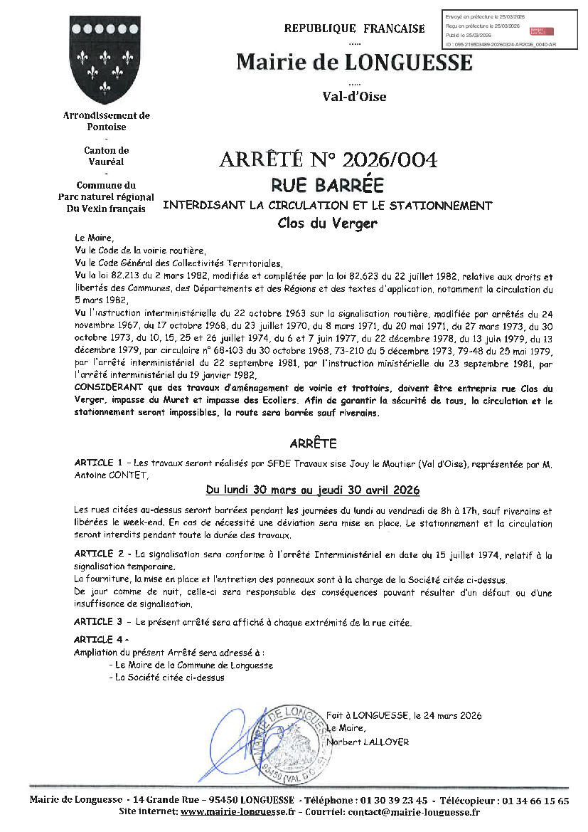 En raison de travaux d'aménagement de voirie et de trottoirs au Clos du Verger