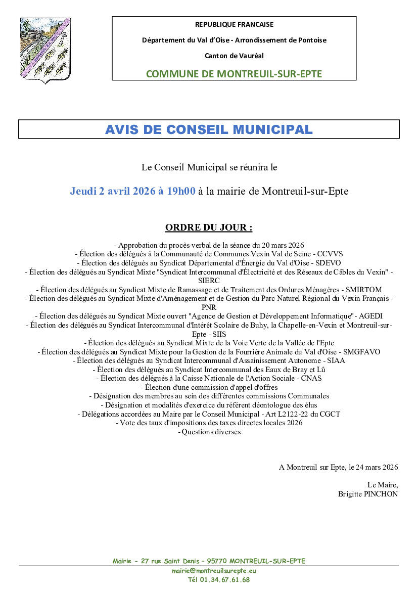 AVIS DE CONSEIL MUNICIPAL À MONTREUIL-SUR-EPTE 31/03/2026 Le Conseil Municipal se réunira le jeudi 2 avril 2026 à 19h à la mairie de Montreuil-sur-Epte.