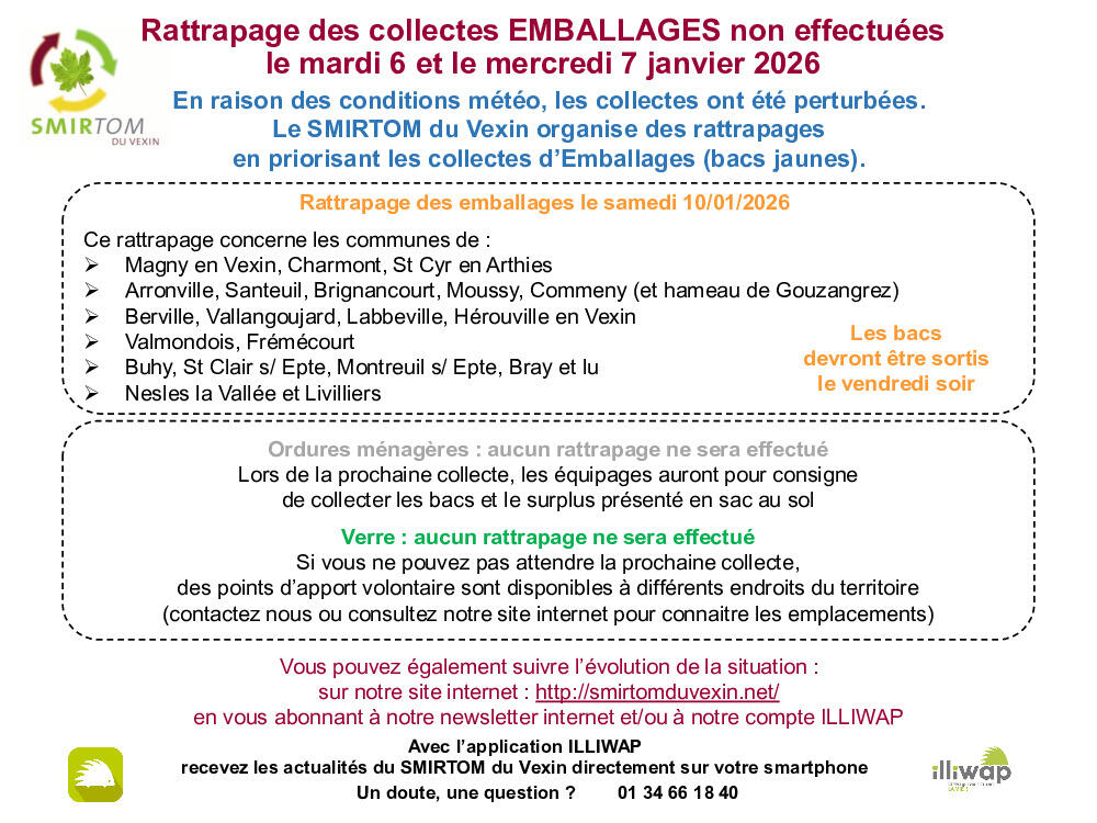Nous vous informons que seules les communes concernées par la collecte des emballages auront un rattrapage. Il sera effectué le samedi 10 janvier 2026 (les bacs devront être sortis la veille au soir).