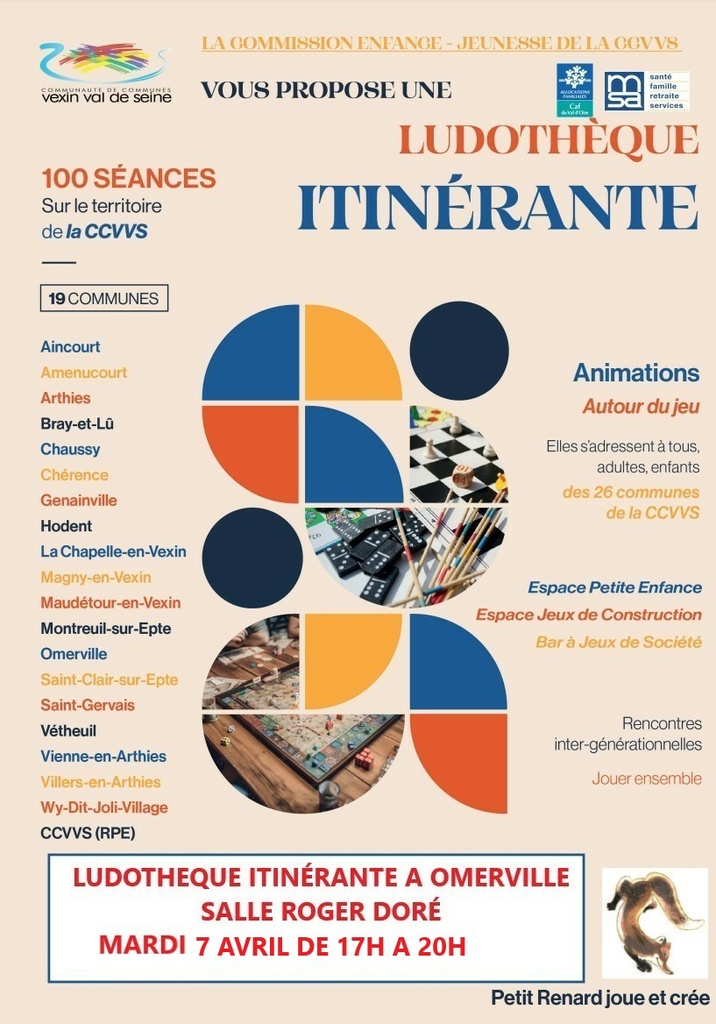 Passage de la ludothèque itinérante ce mardi 7 avril de 17h à 20h à Omerville dans la salle Roger Doré. Gratuite et ouverte à tous les habitants de la CCVVS. Venez nombreux, en famille ou avec vos amis...