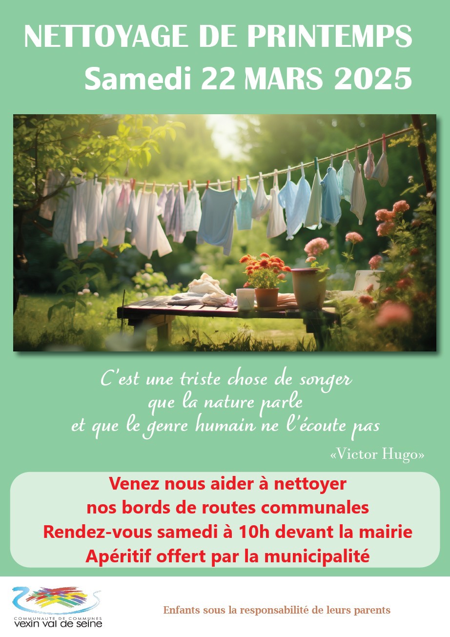 Une opération "nettoyage de printemps" aura lieu ce week-end dans plusieurs villages de notre communauté de communes pour nettoyer les bords de nos routes communales. La municipalité d'Omerville adhère depuis quelques années à cette opération initiée par la CCVVS. Elle aura lieu ce samedi 22 mars de 10h à 11h30 à Omerville. Rendez-vous devant la mairie à 10 heures. Nous vous fournirons des sacs poubelles, merci de bien vouloir apporter des gants. Un apéritif sera offert par la mairie à l'issue de cette opération. Un grand merci à tous ceux qui pourront se rendre disponible.