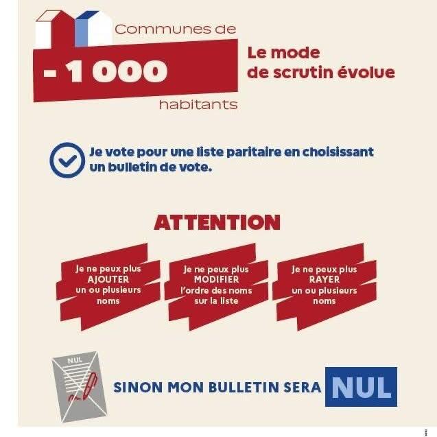 À l’approche des prochaines élections municipales, nous vous rappelons que les règles de scrutin ont évolué afin de modifier l’organisation du vote dans les communes de moins de 1 000 habitants : il n’est plus possible d’ajouter, de rayer ou de modifier l’ordre sur la liste du bulletin de vote.