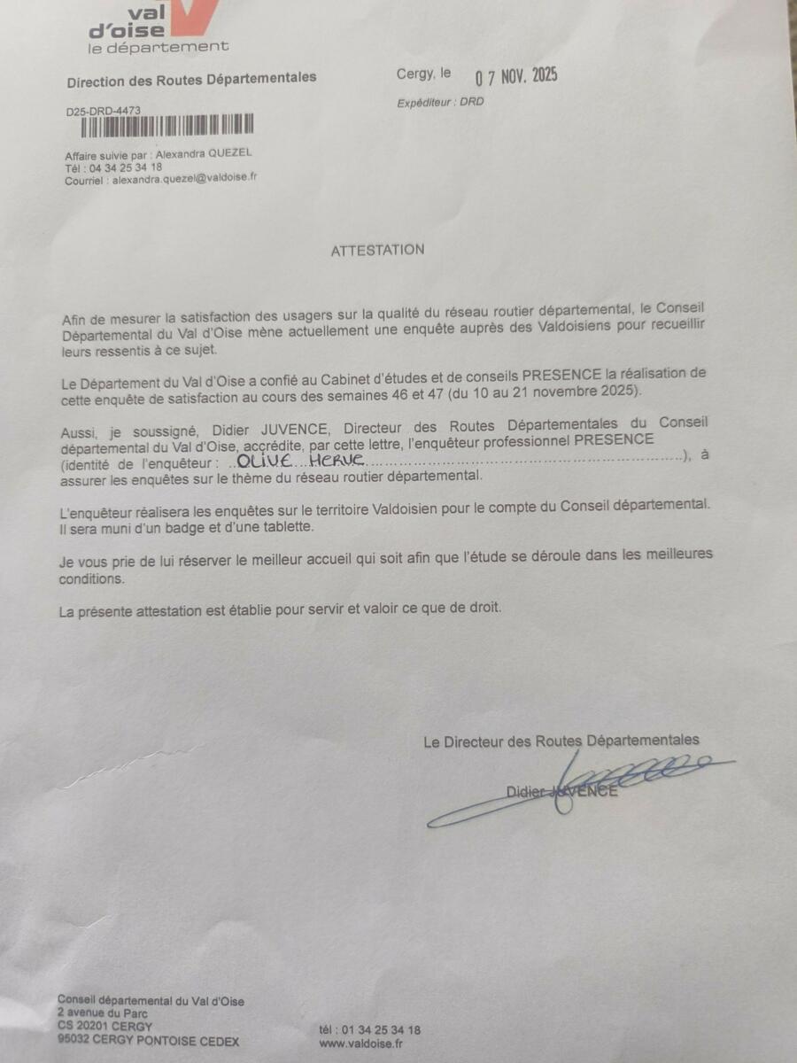 Mr OLIVE Hervé est mandaté pour faire un sondage pour le département du Val d'Oise, qui concerne la voirie