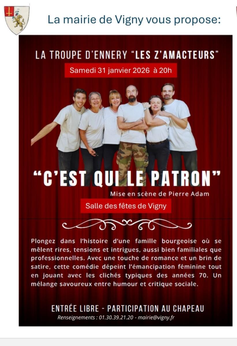 La troupe des "Z'AMACTEURS" et la mairie de Vigny vous propose une soirée théâtre: "c'est qui le patron" vous plonge dans une pièce drôle sur fond de critique sociale pour un savoureux moment!