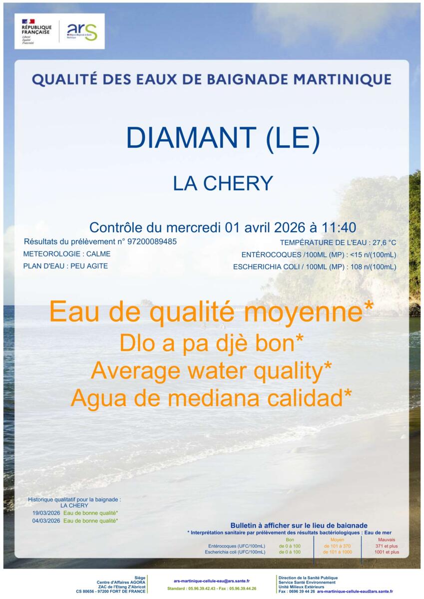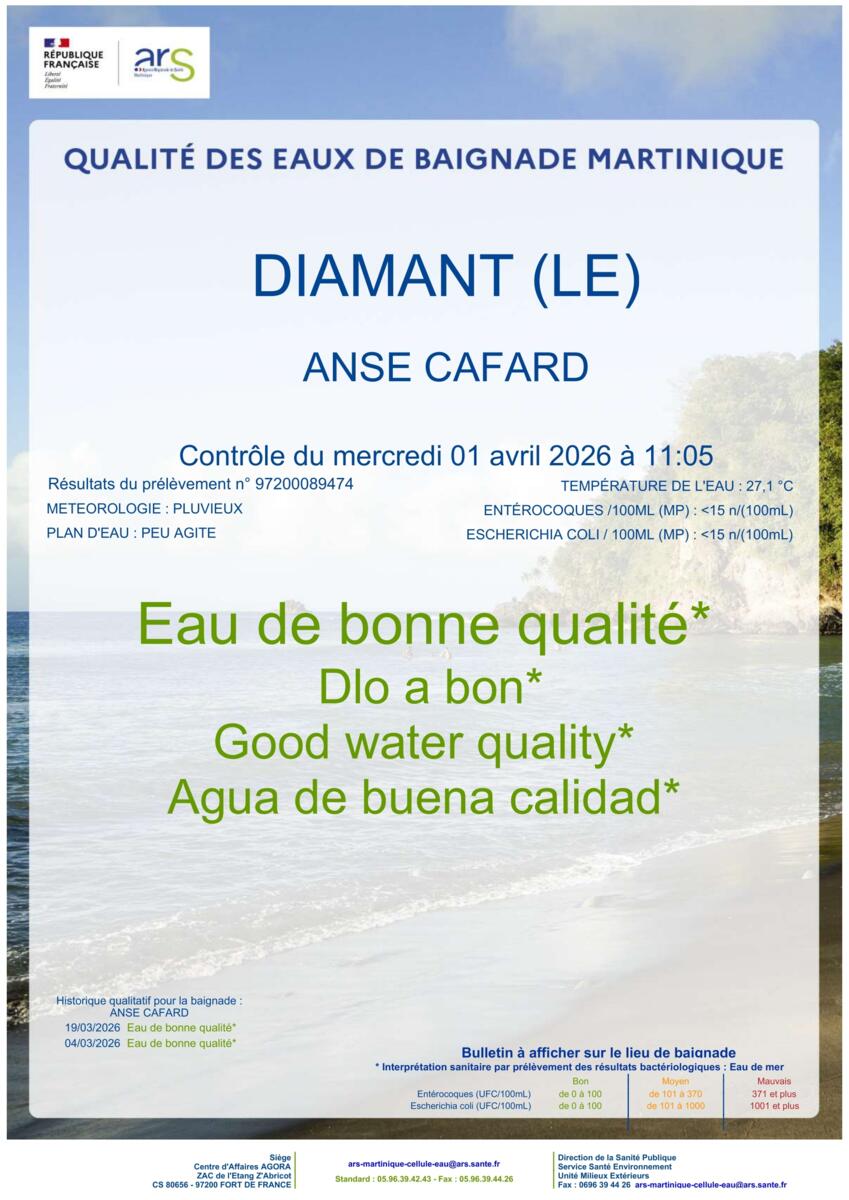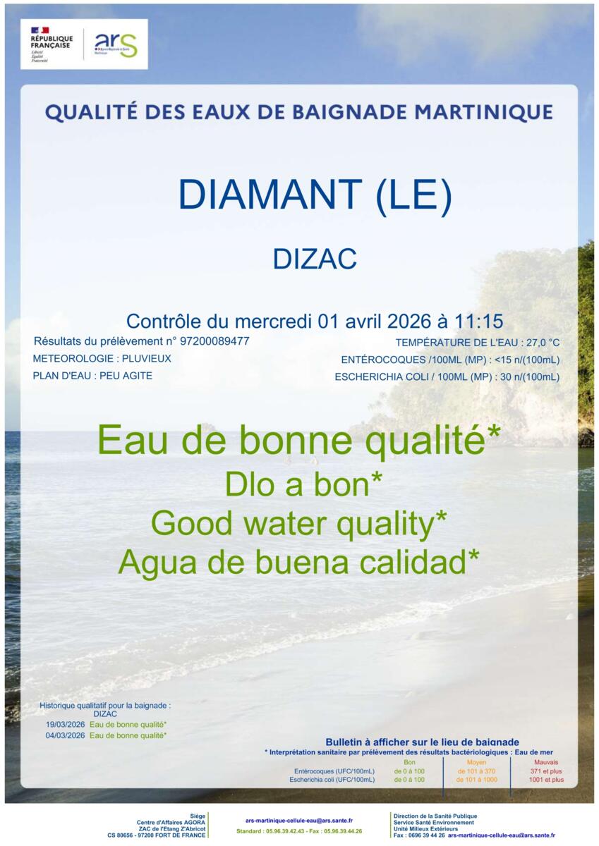 ๐ŸŒŠRetrouvez les rรฉsultats de la qualitรฉ des eaux de baignade des plages du Diamant fournis par l'Agence rรฉgionale de Santรฉ de la Martinique (ARS).