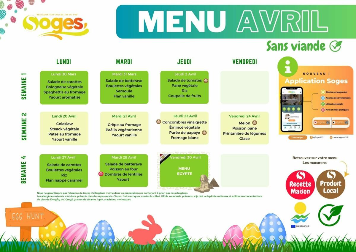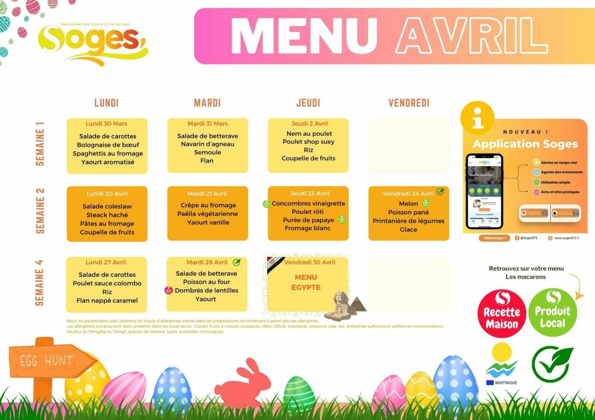 🥘Découvrez le menu de la restauration scolaire pour les écoles maternelles et élémentaires du Sud de la Martinique, par la SOGES, pour le mois d'avril 2026.