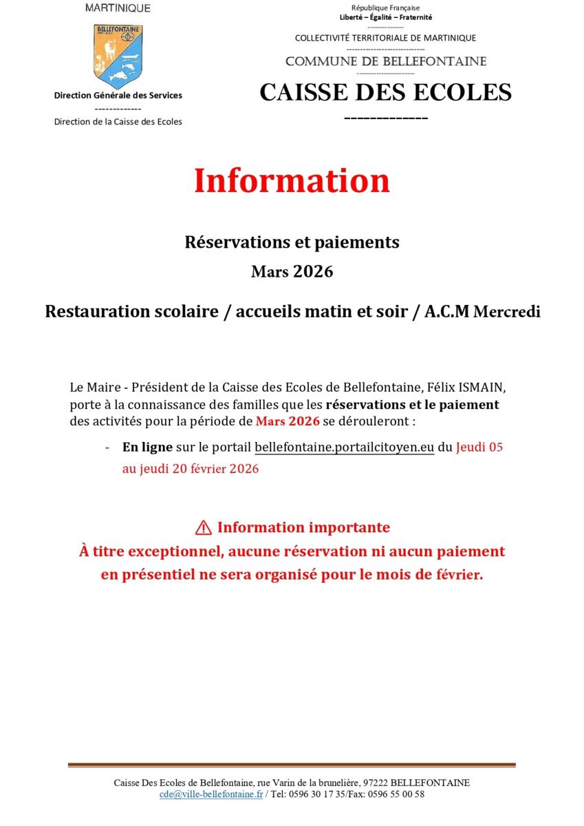 Caisse des Ecoles : Fév. 2026 - pas de paiement présentiel