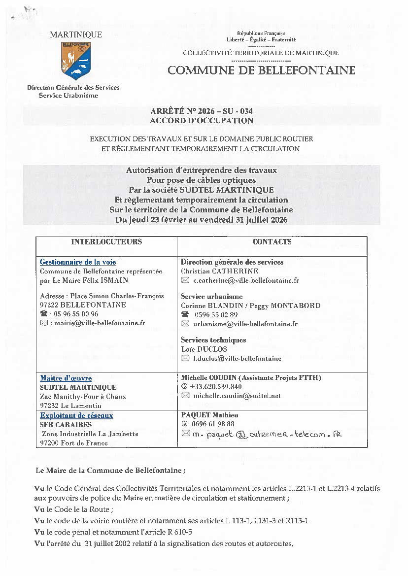 🚧 Des travaux de pose de câbles de fibre optique sont actuellement réalisés par la société SUDTEL Martinique sur le territoire communal, jusqu’au 31 juillet 2026.