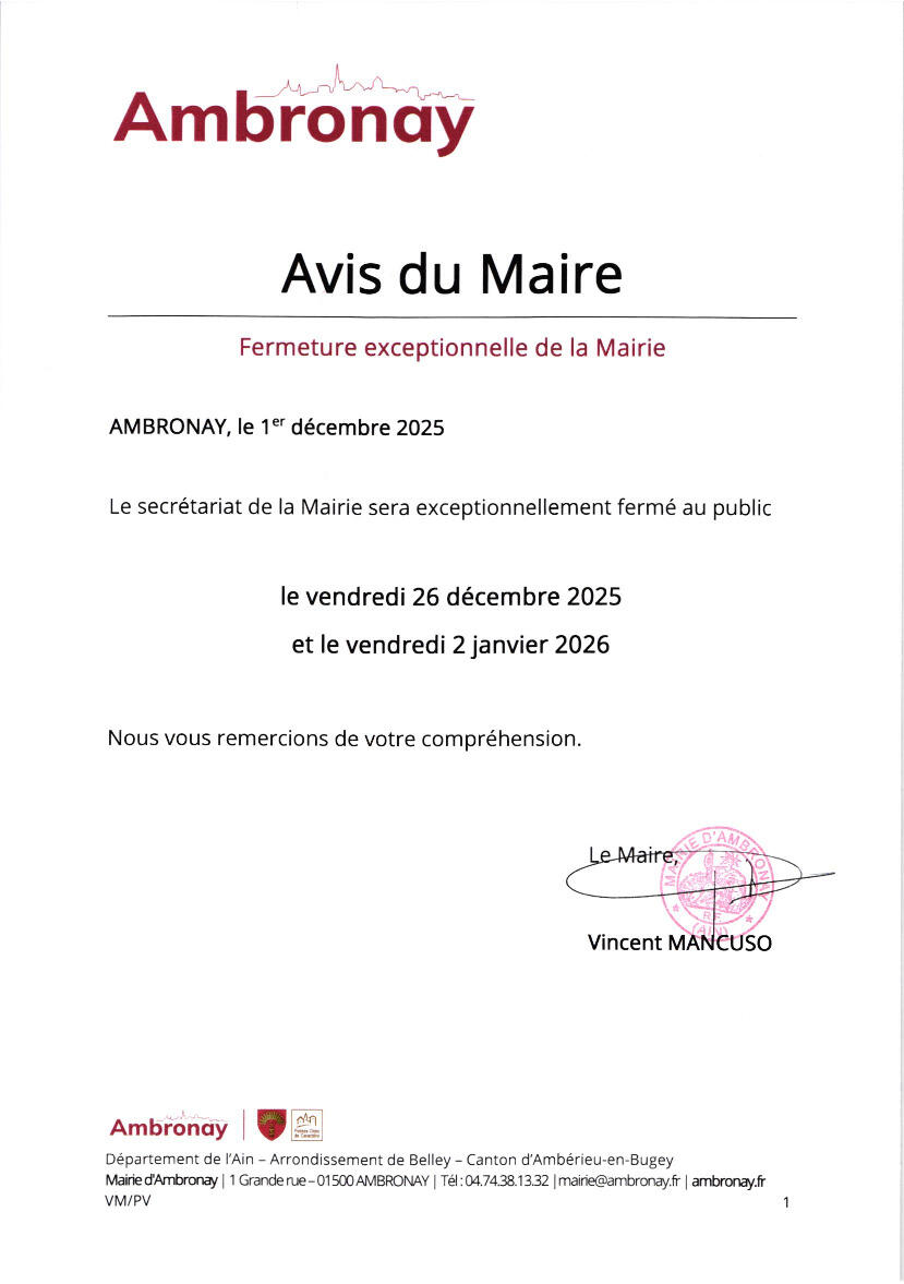 Le secrétariat de la Mairie sera exceptionnellement fermé au public le vendredi 2 janvier 2026.