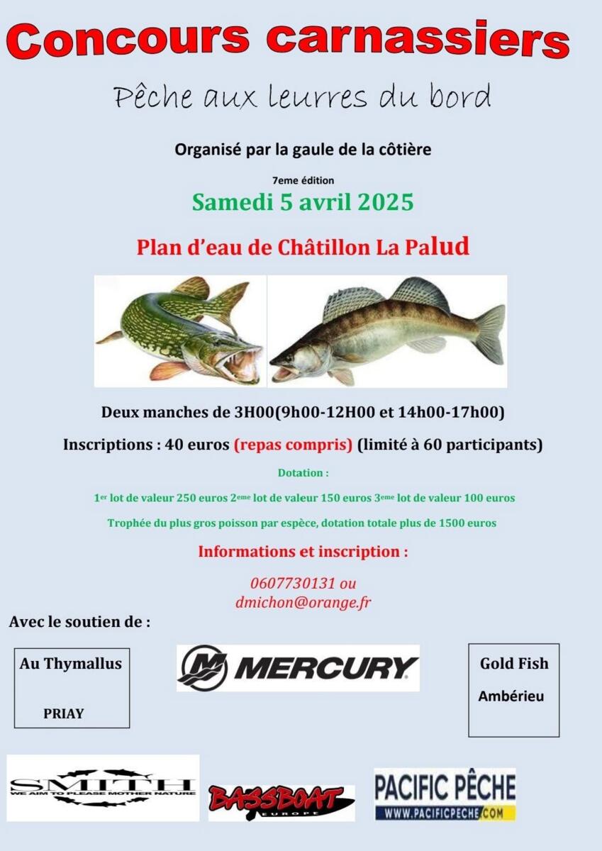 Concours carnassiers 11/03/2025 Concours carnassiers le samedi 5 avril aux leurres. Contact au 0607730131.