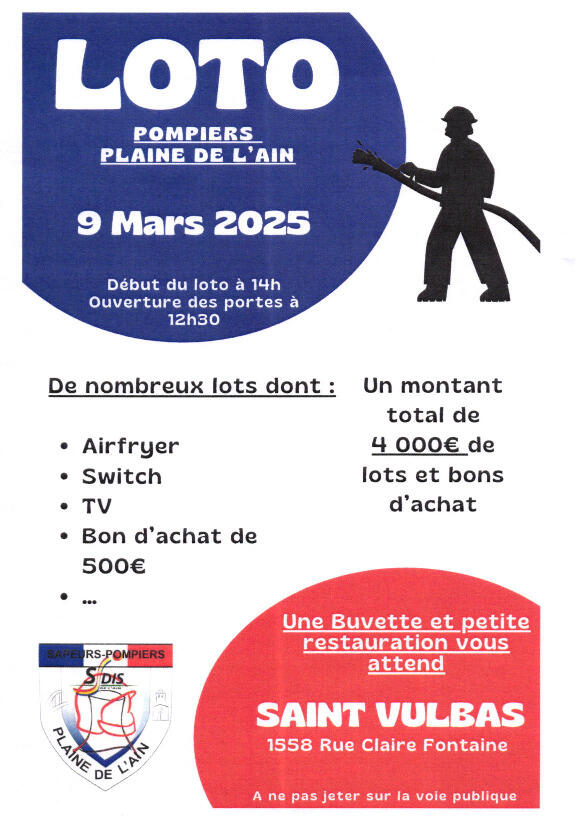 9/03 - Loto de l'Amicale des pompiers 🚒 09/02/2025 LOTO LE DIMANCHE 9 MARS A 14H 🚒 ouverture des portes à 12h30 au Centre de Rencontres