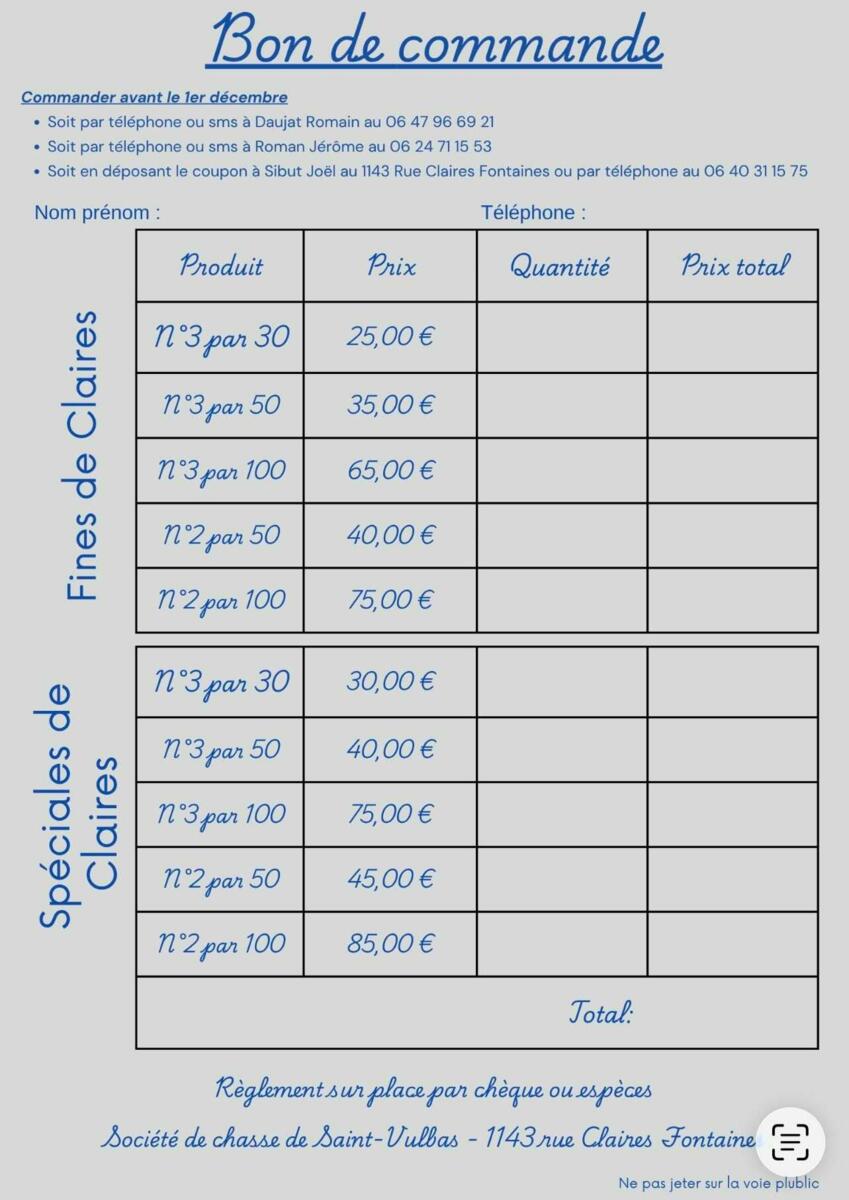 Retrait ce dimanche 21 décembre de 9h à 14h à la cabane de chasse (moulin en face du CIR)