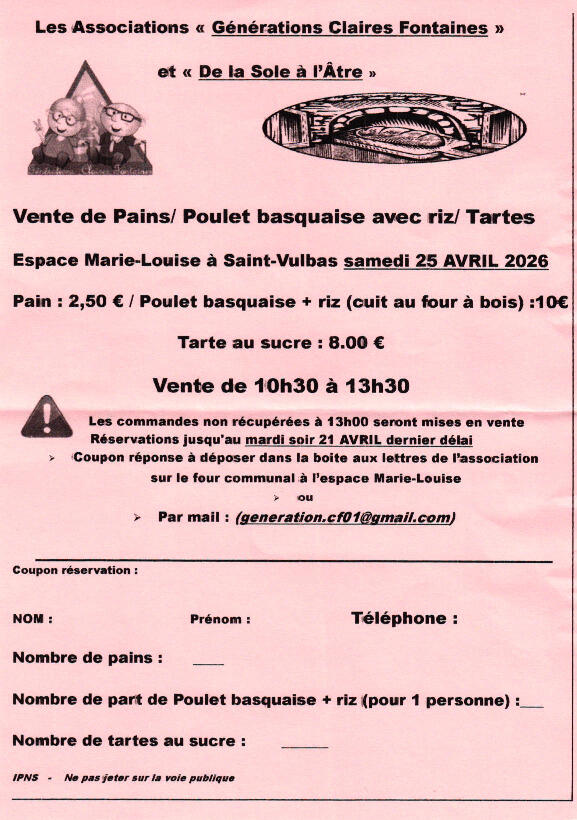 Les associations "Générations Claires Fontaines" et De la Sole à l'Atre" vous proposent une vente de pains, poulet basquaise et riz, tartes le samedi 25 avril, à l'Espace Marie-Louise.