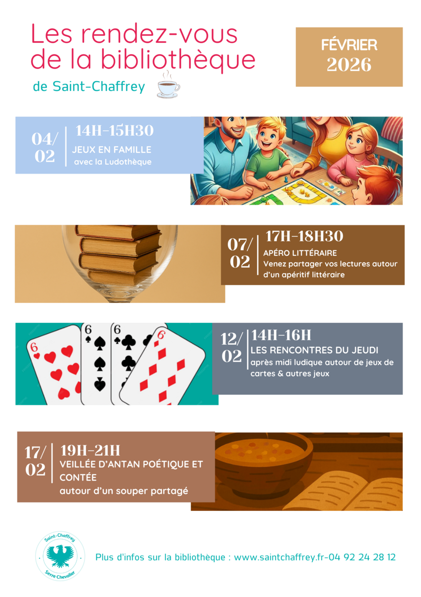 En février, la bibliothèque vous propose : 🎲 des jeux en famille pour rire ensemble, 🍷📚 un apéro littéraire pour savourer les mots, 🃏🎲 les rencontres du jeudi où cartes et plateaux réveillent l’esprit joueur, ✨📖 et une veillée d’antan poétique et contée qui rallume la flamme des souvenirs.